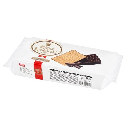 SECPOL Sękacz Królewski w polewie 300 g - Sękacz pokrojony w cienkie kawałki, oblany polewą kakaową, produkt o łącznej masie netto 300 g, umieszczony w praktycznej plastikowej tacce, opakowany w ozdobną folię z kolorowym nadrukiem.